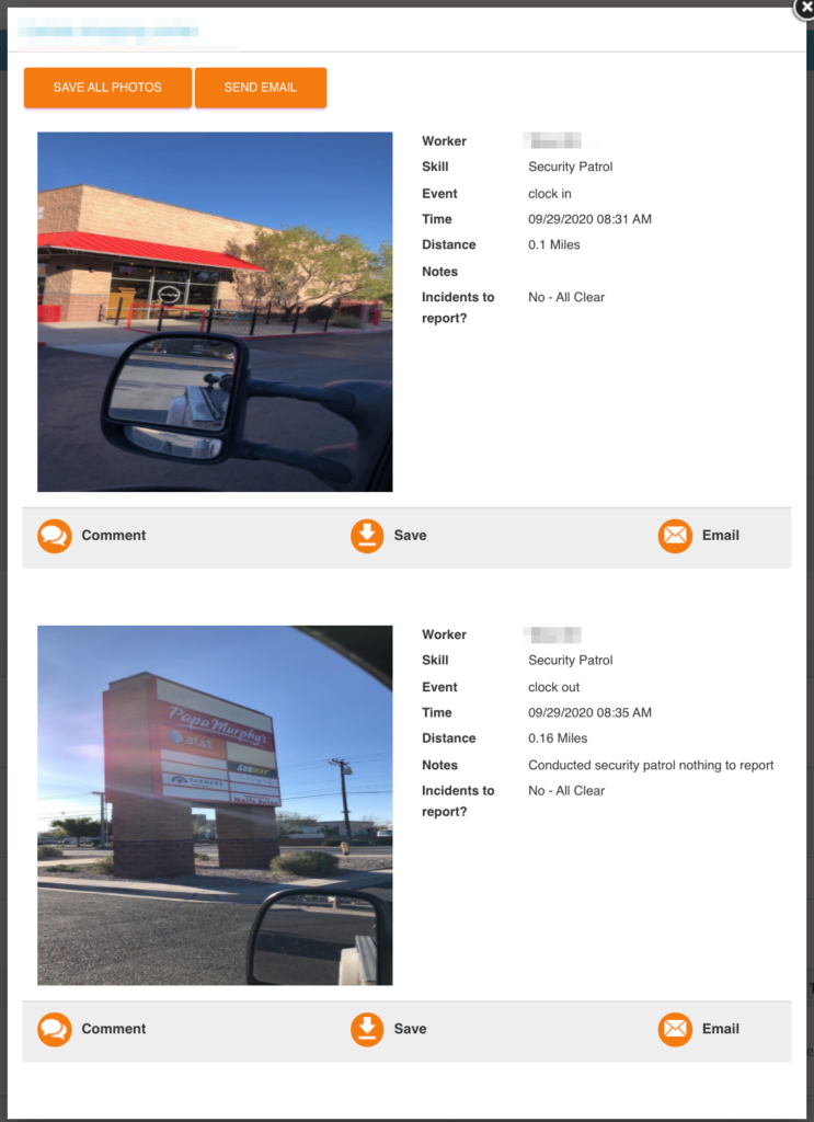 - Information Options: These options allow you to add more information to the report such as any custom information captured in the app by the employee, duration of the visit, arrival and departure time, show all the notes the worker took during the visit (adding up the notes for every photo the employee took), show the skill the employee selected (ie. security, inspections, etc)